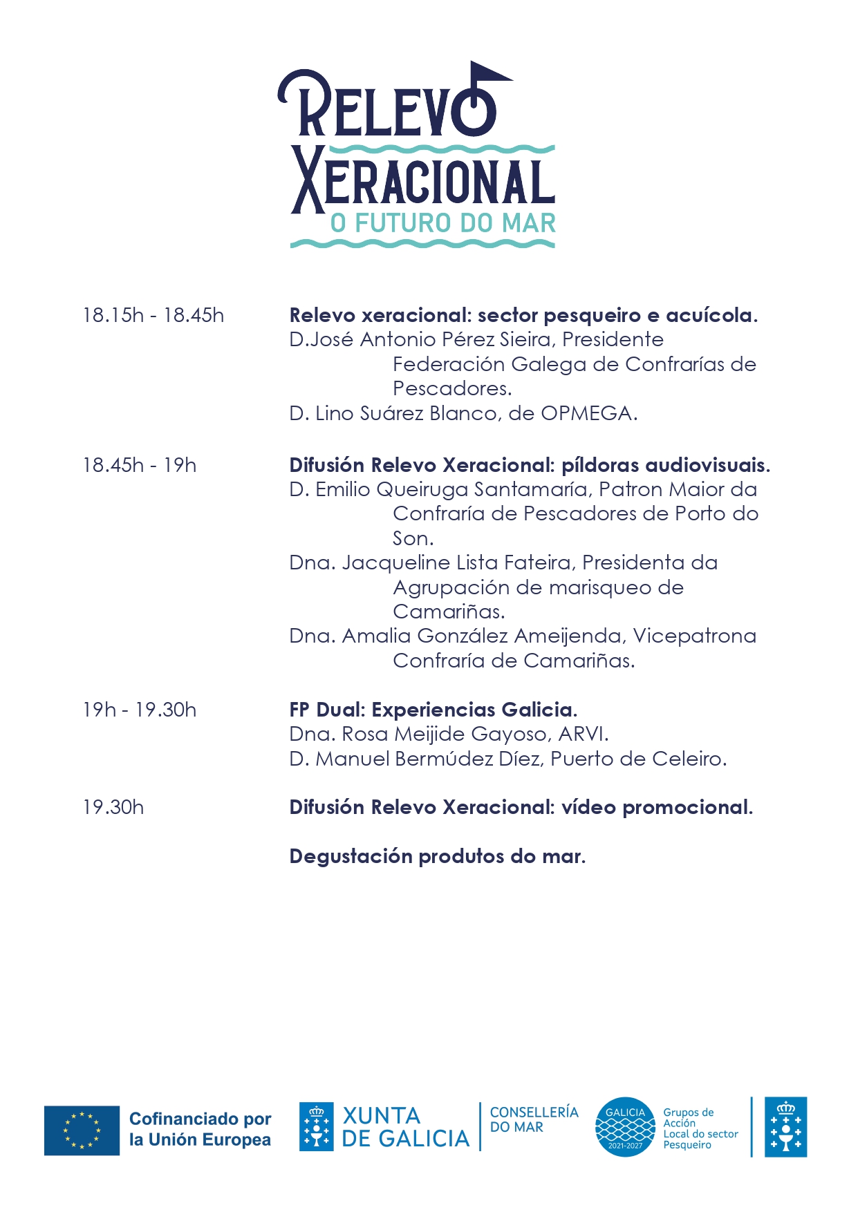 Durante o evento presentaranse os obxectivos e accións do proxecto, así como as oportunidades de participación para o sector, os centros educativos e a sociedade. Contaremos coa presenza de representantes institucionais, profesionais do mar e entidades colaboradoras. Haberá un petisco de produtos do mar de cada territorio GALP.
