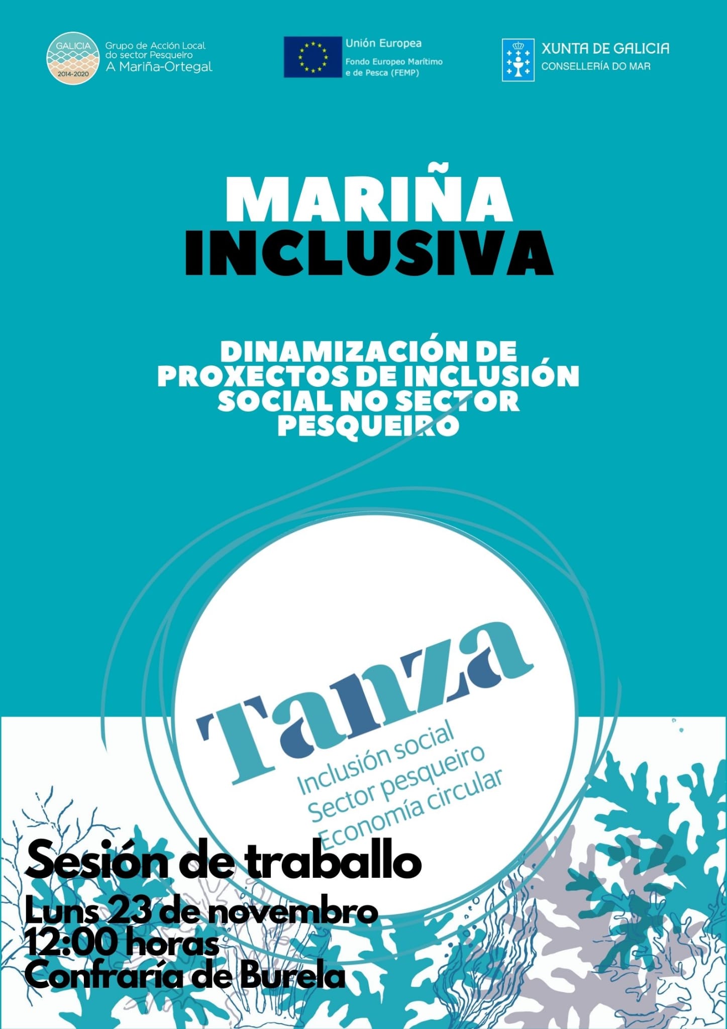 Hoxe ás 12.00 h dentro do marco do proxecto Tanza-Emprego inclusivo na zona costeira, tivemos unha reunión de traballo na Confraría de Pescadores de Burela: "Mariña Incluisva".