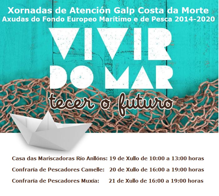 Nestas xornada o Equipo Técnico do GALP Costa da Morte atenderá particularmente a todas as persoas que estean interesadas en informarse das Axudas do Fondo Europeo Marítimo e de Pesca 2014-2020, dirixidas principalmente a xente do mar, emprendedores, hostaleiros, sectores auxiliares da pesca e actividades vinculadas ao Mar e Litoral.