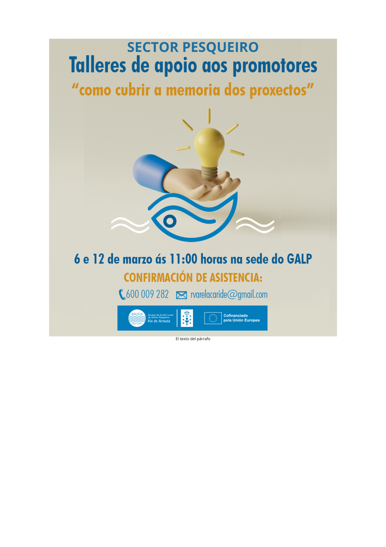 vánse a realizar dous talleres para apoio dos promotores do sector pesqueiro e empresas relacionadas, no que respecta a presentación dos proxectos.