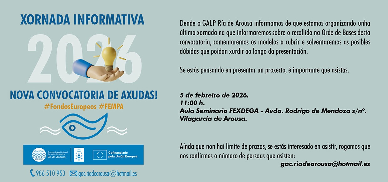 Dende o GALP Ría de Arousa informamos de que estamos organizando unha última xornada na que informaremos sobre o recollido na Orde de Bases desta convocatoria, comentaremos os modelos a cubrir e solventaremos as posibles dúbidas que poidan xurdir ao longo da presentación.