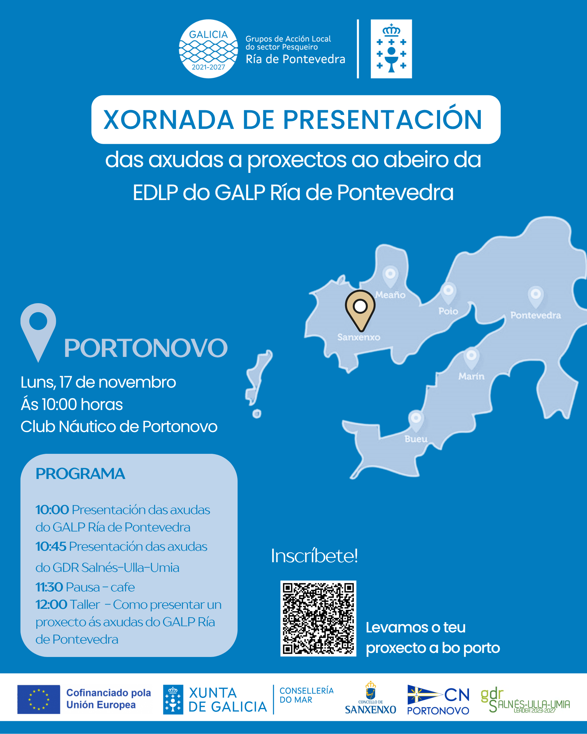 O Grupo de Acción Local do Sector Pesqueiro Ría de Pontevedra (GALP-RP) celebrará o vindeiro 17 de novembro unha nova xornada informativa sobre as axudas que xestiona no marco do Fondo Europeo Marítimo, de Pesca e de Acuicultura (FEMPA) 2021-2027. O encontro desenvolverase ao longo da mañá, a partir das 10:00 horas, no Club Náutico de Portonovo, grazas á colaboración do propio club, do Concello de Sanxenxo e do Grupo de Desenvolvemento Rural (GDR) Salnés-Ulla-Umia.