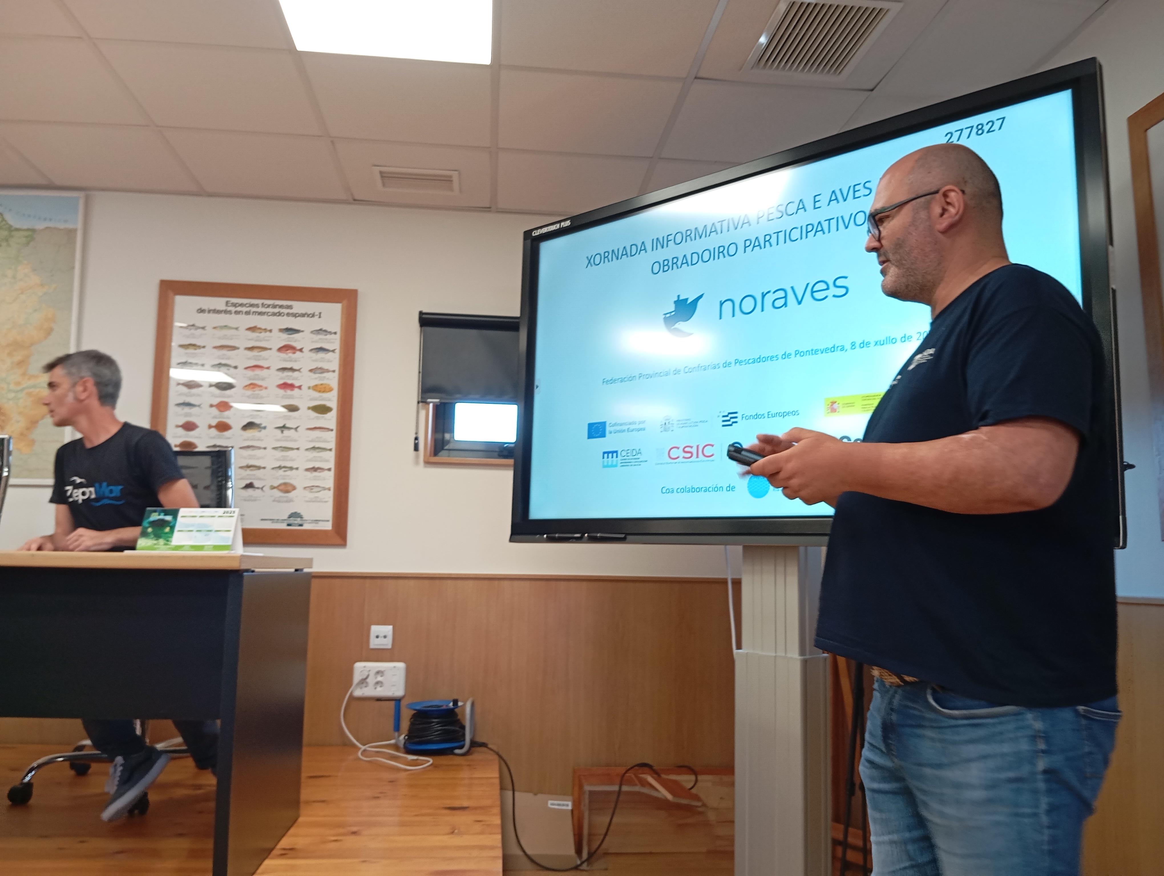 O día 8 de xullo tivo lugar na Federación provincial de Confrarías de Pescadores de Pontevedra en Arcade, a xornada informativa “Pesca e aves mariñas” organizada polo CEIDA (Centro de Extensión Universitaria e Divulgación Ambiental en Galicia). Esta xornada encadrase dentro do proxecto “Noraves” que estuda a mortandade accidental das aves mariñas en artes de pesca (sobre todo artes de pesca artesanais).